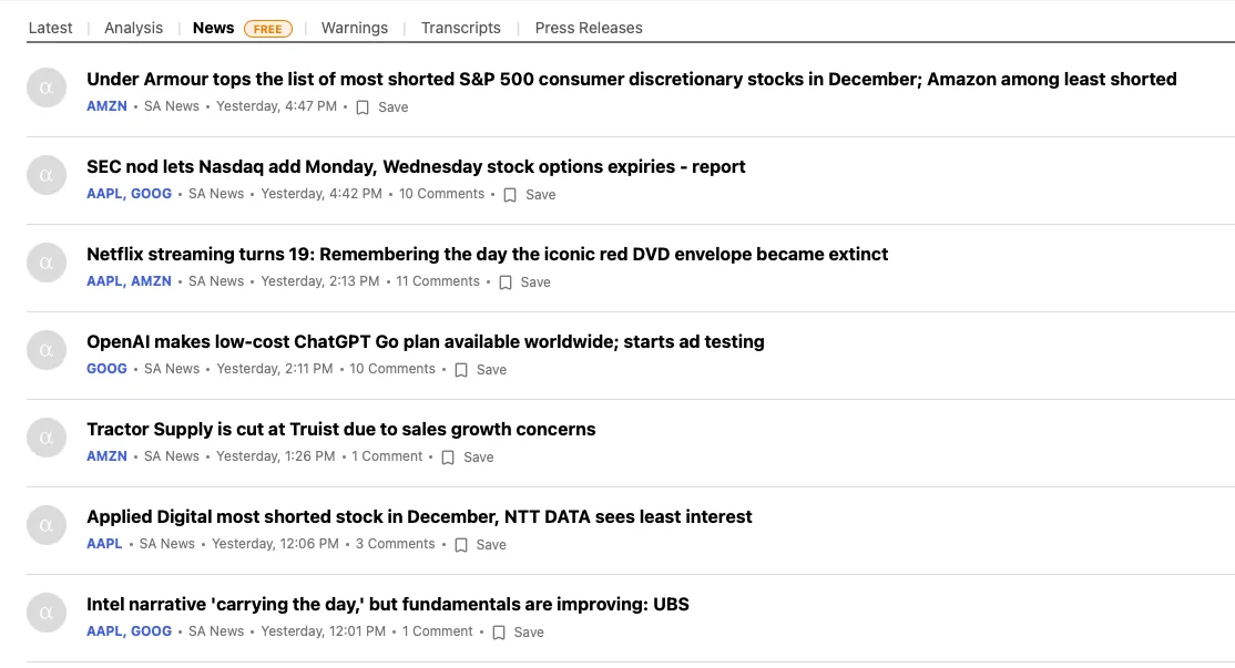 Seeking Alpha is well known for its deep fundamental articles and analyst commentary. The issue is structural: news only surfaces after someone from Seeking Alpha decides to write about it.