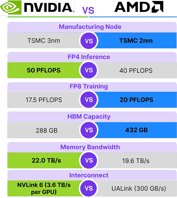 Interconnect: Nvidia - NVLink 6 (3.6 TB/s per GPU) vs AMD - UALink (300GB/s)